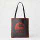 Rustic Halloween scene has a haunted house, creepy old trees and a witch flying through the sky. Scene is inside a deep orange moon on a cracked paint black background. The background is edged in a black and orange striped pattern. It says Happy Halloween in a curved text around the moon. Reverse side is the same. This cool tote bag will be perfect for trick or treating year after year.