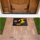 A graphic design of Halloween witches with the text 'Welcome- the witch is in" on a funny door mat.