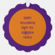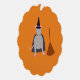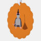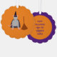 This awesome Halloween ornament card makes a lovely decoration that can be hung up like an ornament or sent in an envelope like a conventional card. The design features a digital art image of a cute grey rat witch with pink ears, nose, feet and tail. The rat is wearing a black pointed hat with a gold buckle and purple stars all over it. The rats is also wearing a black cloak also covered in purple stars. Next to the rat is a brown broom made of twigs. This rat is dressed up ready for a Halloween party. There is custom text on the back so you can fully personalise this ornament card meaning it is also suitable for use as a present tag.