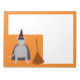 This awesome notepad features a digital art image of a cute grey rat witch with pink ears, nose, feet and tail. The rat is wearing a black pointed hat with a gold buckle and purple stars all over it. The rats is also wearing a black cloak also covered in purple stars. Next to the rat is a brown broom made of twigs. This rat is dressed up ready for a Halloween party.