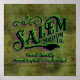 Salem Broom Company sign in black, green and purple glow and featuring a gothic green patterned background.