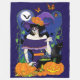 A witch all dressed up in purple and orange with a sugar skull day of the dead make up on, Black cat, cauldron, pumpkins and a full moon.