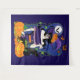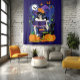 A witch all dressed up in purple and orange with a sugar skull day of dead make-up on. Black cat, pumpkins, cauldron and a full moon