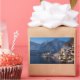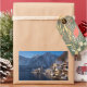 Rectangular photo sticker of the town of Hallstatt covered in snow at the lakeside of the Hallstätter See lake with Alps mountains in the background in the first light of the sunrise in a winter landscape in Austria.