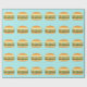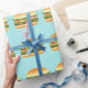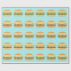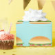 This wrapping paper features Destei's cartoon illustration of a hamburger. The burger is made of meat, green lettuce, red tomatoes, onion, slice of cheese and a few pickles. The bun looks freshly baked and it has some sesame seeds on top of it. The background colour is blue.