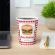 Destei's illustration of a hamburger that has a sesame seed bun that is filled with cheese, lettuce, beef, tomato, ketchup and pickles. The background has a red and white colour gingham pattern. There are also two personalizable text areas. Ideal for birthday parties, backyard barbecues and picnics, for example.
