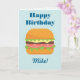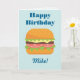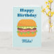 A Happy Birthday greeting card personalised with your recipient's name. A message on the inside which you can customise or leave as is. Designed with an illustration of a simple hamburger. Lettuce, tomato and beef patty. Simple and delicious.
