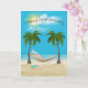 Hammock hanging between two palm trees with starfish and flip-flops on ocean beach sand with summer clouds for 62nd birthday.