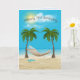 Hammock hanging between two palm trees with starfish and flip-flops on ocean beach sand with summer clouds for 71st birthday.