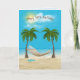 Hammock hanging between two palm trees with starfish and flip-flops on ocean beach sand with summer clouds for 39th birthday.