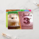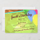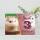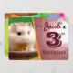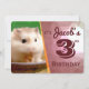 It's your birthday hamster invite card. Design with a furry white and brown hamster. The background is a colourful bright magenta geometric design. The back is decorated with colourful balloons floating up to the sky over colourful geometric shapes. Here, you can also put in detail information about the party: name, location, date, time, etc.
