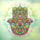 Hamsa Hand Psychedelic Art, made on Vector Graphic Techinque, using several multi-coloured elements patiently assembled like a puzzle to compose the Hamsa Shape. Symbol of Protection.