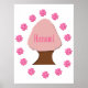 This poster features a graphic image of a cherry tree covered in pink blossom and surrounded by a circle of pretty cherry blossom flowers known as Sakura. This design has been created to celebrate the Japanese Hanami festival and contains the word Hanami in the cherry tree. The celebration marks Spring as people get together to picnic underneath the blooming cherry trees.
