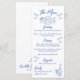 European Inspired Blue and White Whimsical Wedding Dinner Menu. This enchanting wedding menu card features a charming design inspired by Italian, French, and European aesthetics. A hand-drawn place setting illustration graces the top, while a champagne bottle and glass at the bottom are accented with scattered hearts for a romantic and elegant touch. The front highlights your menu details in a mix of handwritten script and simple fonts, offering a whimsical yet refined feel to your celebration.