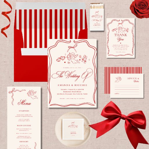 Set the tone for a romantic vintage bridal shower with this hand drawn cherub invitation featuring an elegant red Cupid illustration and a heart monogram frame. Inspired by European antique engravings, it brings a touch of timeless love and retro charm to your celebration. Perfect for a Valentine-inspired, romantic garden, or traditional bridal theme. This red cherub invite blends sentiment and sophistication for brides who adore old-world romance.