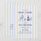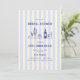 Celebrate the upcoming nuptials of your favourite bride-to-be in style with our whimsical mediterranean themed bridal shower invitations! This invitation features a hand-drawn illustration of food and wine in a fun and playful style accompanied by a casual, handwritten font that perfectly captures the excitement and joy of the occasion. The invitation sets a serene and joyous tone for the occasion, featuring a soft and inviting colour palette of buttercream and soft blue stripes. This tranquil backdrop is perfectly complemented by the dark blue text, creating a harmonious blend of colours.