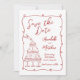European Inspired Red and White Fun Swirling Frame Save the Date Card. This whimsical and creative save-the-date card, inspired by Italian, French, and European elegance, is perfect for couples who want to set a playful yet refined tone for their upcoming wedding. Designed with a bold red and white palette, the card features a swirling frame with heart details that encircle your wedding information, presented in a charming mix of script and handwritten-style fonts for a casual yet sophisticated feel.