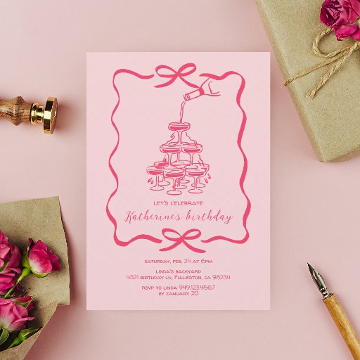 Hand Drawn Pink Champagne Tower Birthday Party Invitation