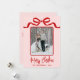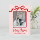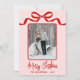 Send holiday cheer with this vertical Christmas card featuring a single centered photo framed by a simple swirling ribbon-style border. A hand-drawn coquette bow sits at the top, with all ribbon and outline details shown in red for a clean, festive look. Below the framed photo, “Merry Christmas” appears in red handwritten script, with space beneath it to center your family name or individual names.