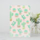 A pattern of various different types of cacti planted in different colours of pots. They are placed on a light pink background and are surrounded with cactus needle shapes. Each cactus is coloured with watercolours in bright green shades!