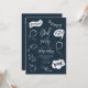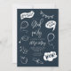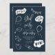 Funky graduation party invitation card featuring hand drawn illustration of graduation and school related icons in navy.