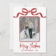 Send holiday cheer with this vertical Christmas card featuring a single centered photo framed by a simple rounded-rectangle outline in red. A hand-drawn coquette bow sits at the top in matching red line art, adding a sweet and festive touch above the image. Below the framed photo, “Merry Christmas” appears in red handwritten script, with space underneath to center your family name or individual names.
