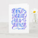 Watercolor hand lettering of congratulations, stacked in a whimsical layout, with flourishes in blue and purple palette.