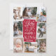 Beautiful typography based religious holiday photo card features eight of your favourite family photos arranged in a collage layout. "Glory to the newborn king" appears in the centre in white hand lettered typography on a cranberry red background dotted with festive stars. Personalise with your family name beneath.
