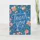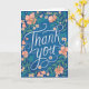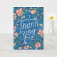 original illustration and lettering by Becky Nimoy "Thank You" in white cursive over blue with peach flowers.