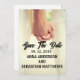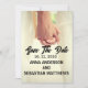 Hand-lettered script overlay design photo wedding saves the date announcement card.