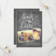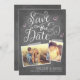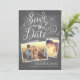 Whimsical and stylish save the date 2-photo announcement featuring modern calligraphy script on a chalkboard background with photo snapshots.