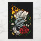 Original vector art of a hand holding playing cards that are on fire. With gold coins, dice, 8 Ball, Ribbon and a rose.