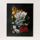 Original vector art of a hand holding playing cards that are on fire. With gold coins, dice, 8 Ball, Ribbon and a rose.