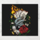 Original vector art of a hand holding playing cards that are on fire. With gold coins, dice, 8 Ball, Ribbon and a rose.