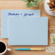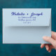 A retro modern hand written bright colourful wedding envelope. Which features bold bride and groom's names in navy colour. And personalised return address . On simple pale light blue vintage colour background. Which suits the whole wedding suite.