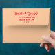 A retro modern hand written bright colourful wedding envelope. Which features calligraphy hand lettered bride and groom's names in red magenta colour. And personalised return address in red also with the mark typography. On simple peach vintage colour background. Which suits the whole wedding suite.