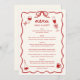 Add a charming touch to your wedding table setting with this hand-illustrated, retro-inspired menu, a delightful mix of unique artistry and whimsical design. This menu card features a wavy frame and a hand-drawn bow at the top, capturing the nostalgia of vintage stationery while keeping it fresh and trendy. With playful, doodle-like illustrations and hand-lettered text, each detail feels crafted by hand, creating a memorable keepsake for your guests as they enjoy the carefully curated meal you’ve planned for your special day.