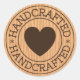 Handcrafted sticker featuring the text "Handcrafted" in brown designed as a stamp on a wooden background.