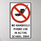 Highway sign advising that handheld cell phones may not be used in a school zone.