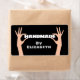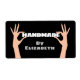 Pair of hands holding the word "Handmade" with custom name. Background colour can be changed.