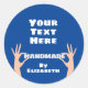 Pair of hands holding the word "Handmade" with custom name & text. Background colour can be changed.