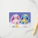 Enclosure card featuring original photography of handmade crochet bunny toys, created and photographed by the artist.