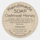 This customisable round vinyl sticker for soap makers has an image of a faux gauze or burlap fabric background in a light brown colour, with fake stitching around the edge.