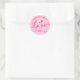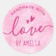 Round sticker with the text "handmade with love" and your custom name in pink on a lighter pink background. The world "love" is written in an elegant calligraphy script font with two white hearts above. Fonts and font colours are customisable. Use as envelope seals, stickers for gifts and favours, product packaging etc. Follow us on Facebook: @businessstationery for more products, news, sales and more.