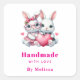 Handmade with Love stickers with an illustration featuring 2 white furry bunnies sharing a big pink heart. The girl bunny is wearing a cute bow on her head and heart-shaped glasses. The boy bunny is wearing an adorable little suit with a tie.