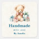 Handmade with Love product stickers with a cute illustration featuring a Victorian style teddy bear. Wearing a fancy red bow. Drawn in a a cute old fashioned vintage style. Red and blue pastel Christmas presents surround this warm-hearted bear.