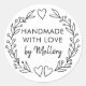 Handmade with Love ... custom stickers for your stationery or product labels. Personalised with your name or business name, this cute design has a doodle drawn botanical wreath with hearts and foliage. It is lettered with modern typography and casual handwritten brush script. A sweet country rustic style design for artisans of handmade gifts and handcrafted retail products.