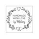 Handmade with love rubber stamp, personalised with your name or business name. This cute design has a doodle hand-drawn wreath with hearts and foliage. It is lettered with modern typography and handwritten brush script. A sweet country rustic style design for artisans of handmade gifts and retail products.