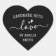 Black, heart shaped stickers with the text "handmade with love" and your custom name. The word "love" is written in an elegant calligraphy script font and the rest of the text in a vintage typewriter style font. Use as envelope seals, stickers for gifts and favours, product packaging etc. Follow us on Instagram: @all.perfectlycustom for more products, news, sales and more.