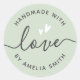 Round stickers with white hearts, the text "handmade with love" and your custom name on a light sage green background. The word "love" is written in an elegant calligraphy script font. Use as envelope seals, stickers for gifts and favours, product packaging etc. Follow us on Facebook: @businessstationery for more products, news, sales and more.